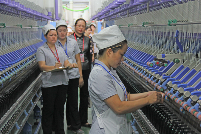 細(xì)紗車(chē)間員工在進(jìn)行擋車(chē)操作技能