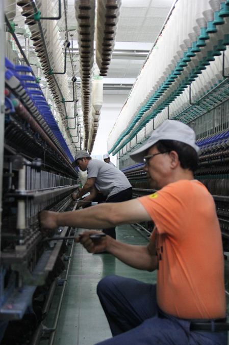 細(xì)紗車間員工在進(jìn)行擋車操作技能比賽